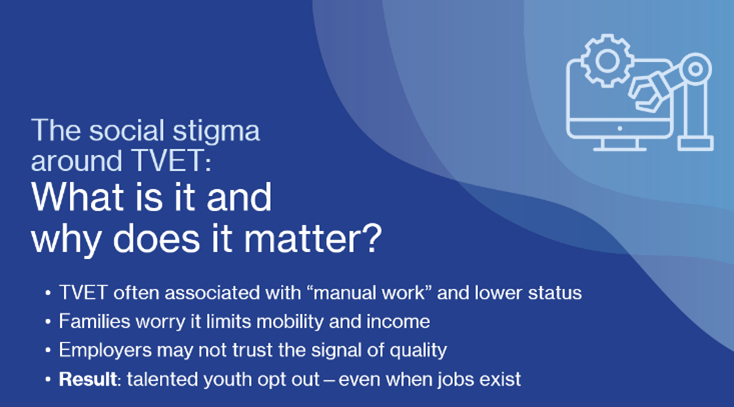 TVET stigma does not persist simply because of outdated attitudes. It is often reinforced by real system weaknesses. Fragmented governance, poor financing, uneven quality standards, limited work-based learning, outdated facilities, weak assessment systems, and most importantly lack of employer partnership, undermine trust in TVET credentials. Ao mesmo tempo, unclear or dead-end pathways make it difficult for learners to see how TVET connects to further education, career progression, or higher earnings.