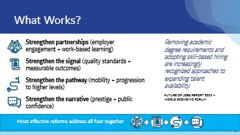 Critically, these levers work best when pursued together. Improving quality without pathways limits impact, and pathways without employer trust fall flat. Alignment is what shifts systems.