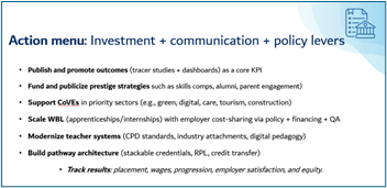Quarto, strengthen the narrative. Prestige follows performance. Public confidence grows when outcomes such as employment, wages, and progression are visible and credible. Career guidance grounded in labor market data helps families and students make informed choices, while governance and standards reinforce the message that TVET is a respected, high-quality pathway.
